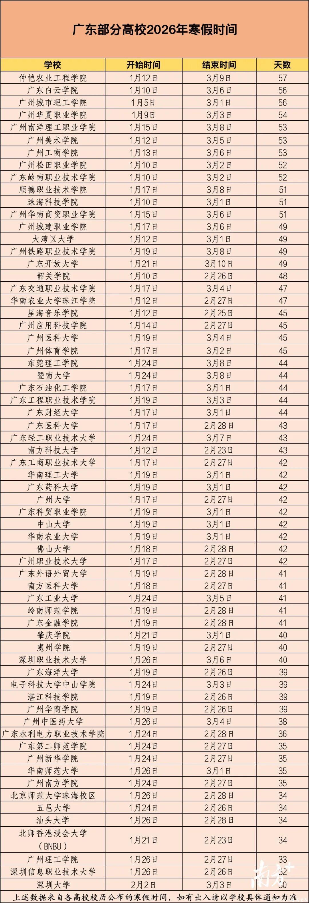 在已统计的放假安排中,广东高校多集中在1月12日至24日这个时间段开始放寒假,时长基本集中在40天左右,多数高校的开学日设置在了元宵节前。